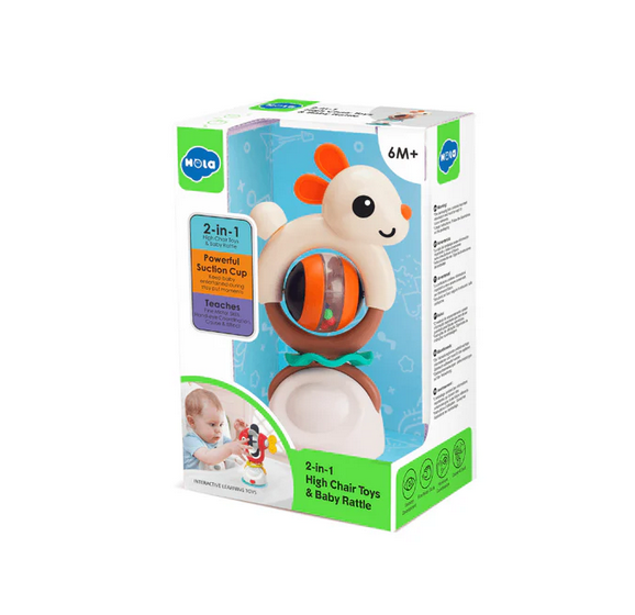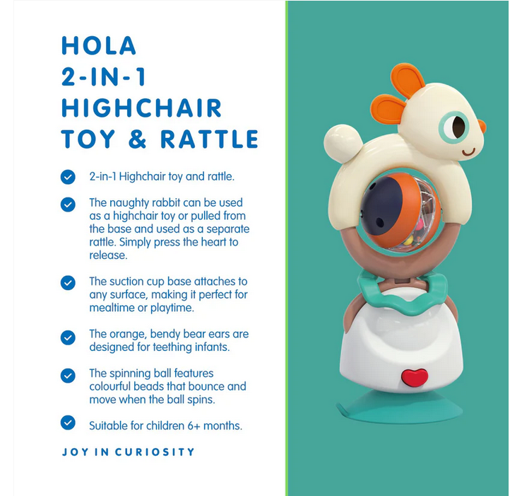 دایناسور جغجغهای هولا مدل Naughty Rabbit 2-in-1 یک اسباببازی دوکاره برای نوزادان بالای ۶ ماه است که هم بهصورت نصبشونده روی سطوح صاف (مانند میز غذا یا صندلی نوزاد) استفاده میشود و هم بهعنوان جغجغه جداگانه. این محصول با طراحی رنگارنگ، توپ چرخان با مهرههای رنگی و گوشهای نرم سیلیکونی (دندانگیر) تجربهای سرگرمکننده و آموزنده را برای کودک فراهم میکند.