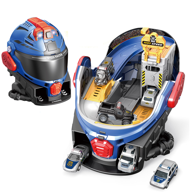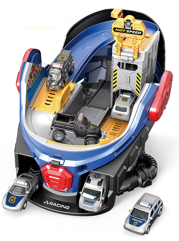 این اسباببازی دارای چراغ و صدا بوده و باعث جذابیت بیشتر بازی میشود. طراحی تبدیلشونده آن باعث میشود کودک همزمان هم یک کلاه پلیس داشته باشد و هم یک پیست مسابقه حرفهای.