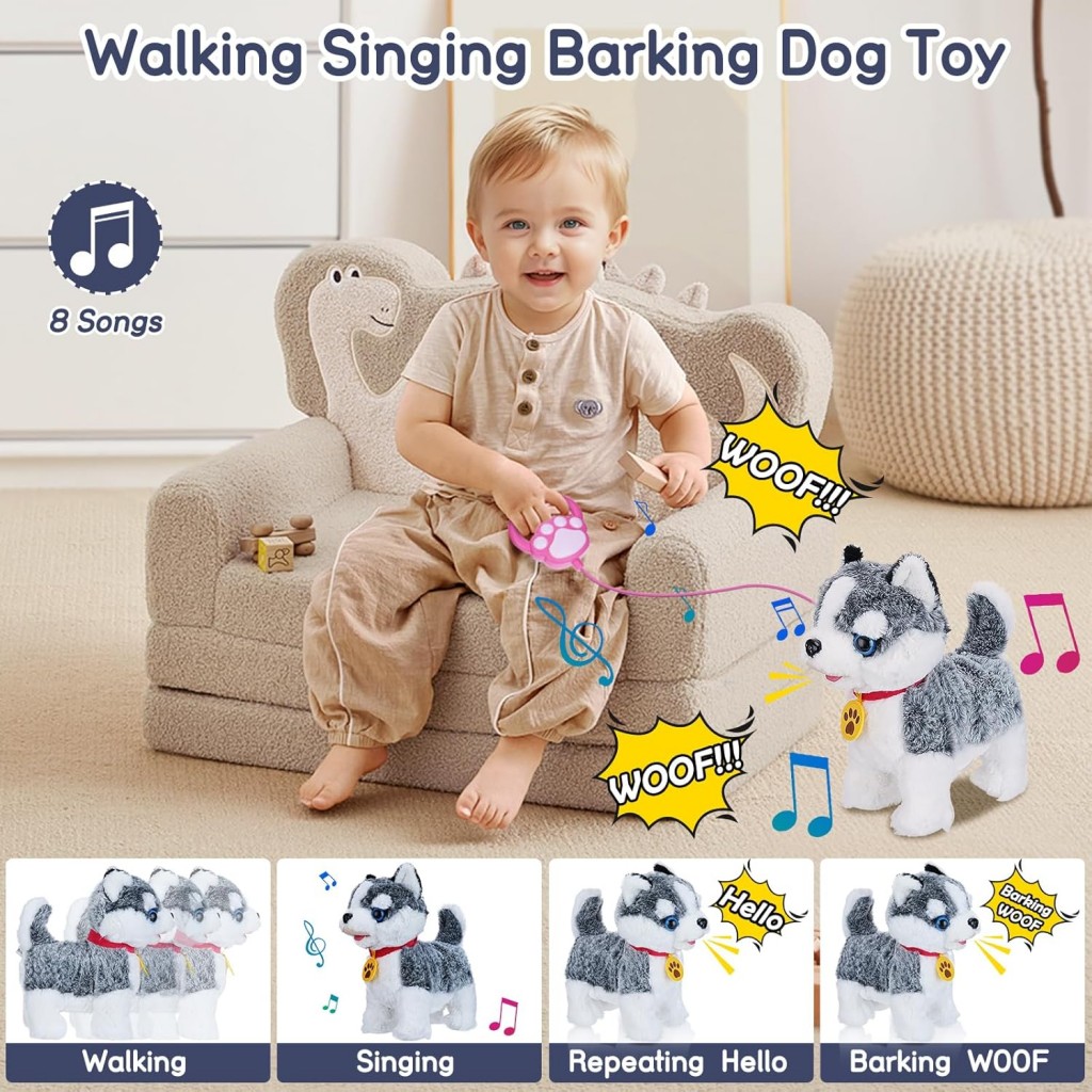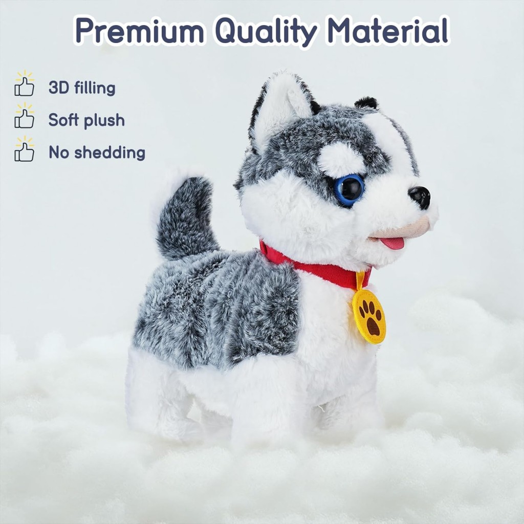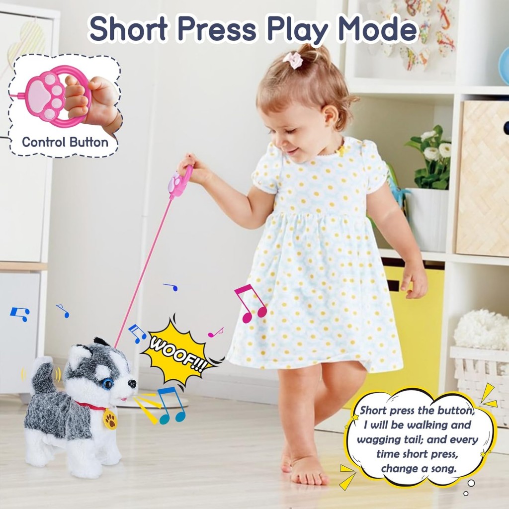 این سگ با قلاده کنترلی حرکت میکند، دمش را تکان میدهد، پارس میکند و با صداهای شاد و جذاب خود، حس نگهداری از یک حیوان واقعی را برای کودک شبیهسازی میکند.