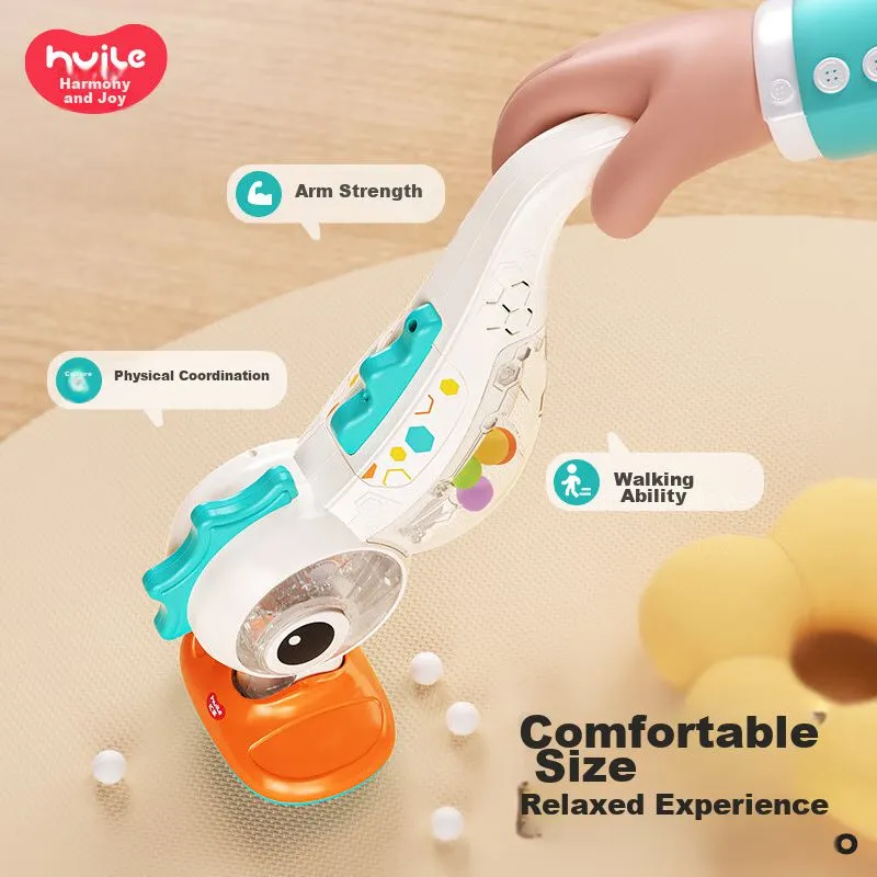 کودک میتواند دسته جاروبرقی را در دست گرفته و آن را روی زمین حرکت دهد. با حرکت دستگاه، صداهای شبیهسازیشده پخش میشود و توپهای رنگی سبک به داخل محفظه مکش نمایشی هدایت میشوند.