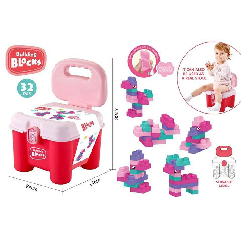 این محصول دارای ۳۲ قطعه بلوک رنگی و درشت است که کودک میتواند با آنها سازههای مختلف مانند خانه، برج، دیوار یا شکلهای خلاقانه بسازد.