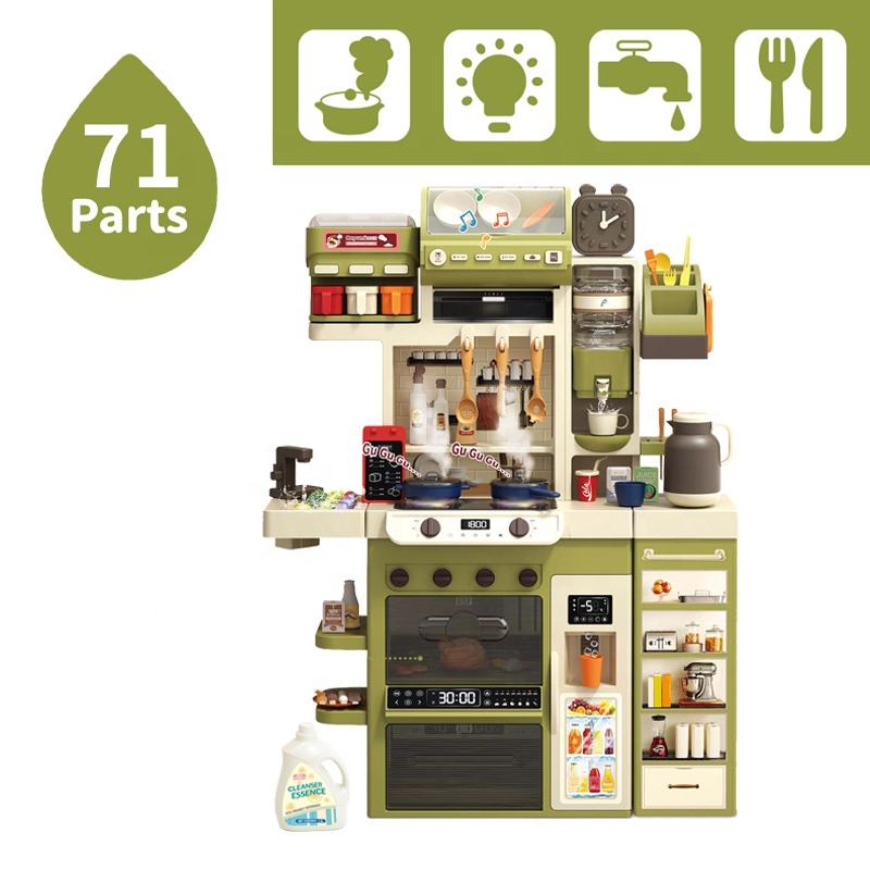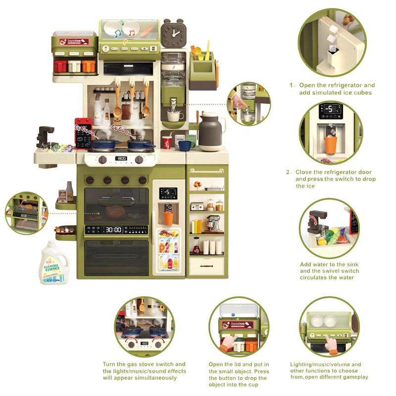 کودک میتواند ابتدا خوراکیها و مواد اولیه اسباببازی را داخل یخچال قرار داده و سپس با قابلمه و ماهیتابه روی اجاق آشپزی کند. با افزودن کمی آب به مخزن مخصوص، بخار واقعی از اجاق خارج میشود و تجربه آشپزی را برای کودک بسیار واقعیتر میکند.